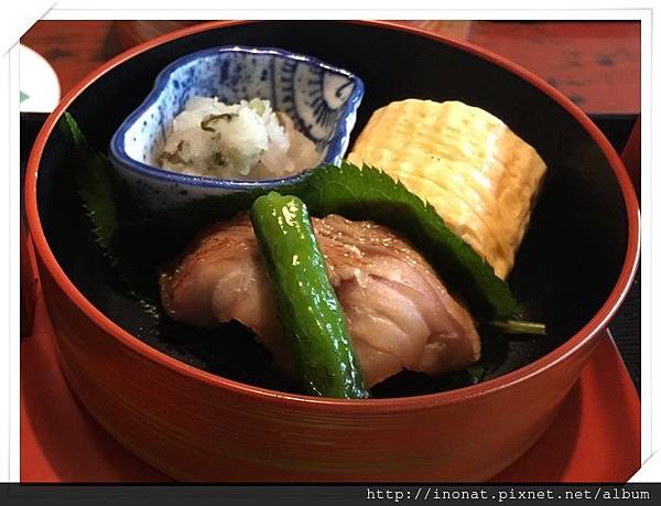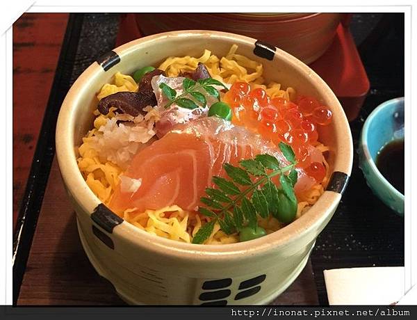 它的醋飯搭配上面的蛋絲跟魚卵食用