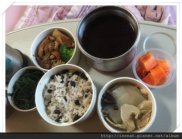 菜單:燕麥飯、芥蘭豬肉、羅勒鯛魚湖鯛、皇宮菜、杜仲牛蒡軟骨湯、月子水、甜湯、水果